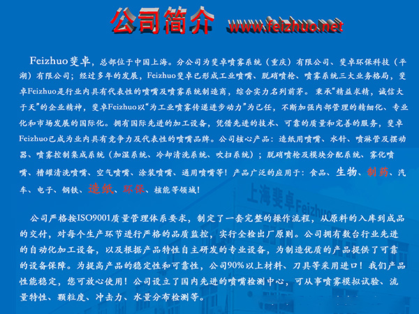 Feizhuo斐卓,以致力于為噴霧技術(shù)傳遞進(jìn)步動(dòng)力為己任!堅(jiān)持自主研發(fā)創(chuàng)新,采用行業(yè)高端設(shè)備和儀器,不斷提升產(chǎn)品的性能,讓斐卓制造的產(chǎn)品能夠完全達(dá)到行業(yè)高標(biāo)準(zhǔn)的要求,實(shí)現(xiàn)國(guó)際化的市場(chǎng)供應(yīng)!噴嘴產(chǎn)品及噴嘴的應(yīng)用咨詢熱線:139 1663 9930!